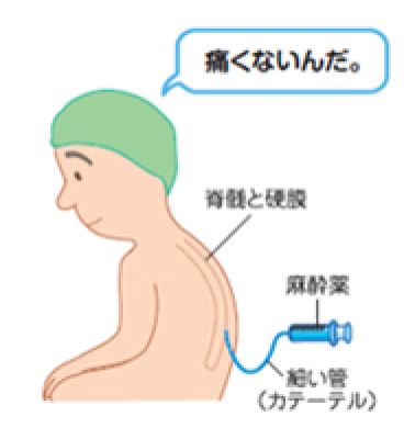 硬膜外腔に専用の細いカテーテルを入れ,1回注入や持続注入の形で局所麻酔薬を作用させます.硬膜外腔という解剖のお話はここでは割愛しますが,脊髄から出たばかりの脊髄神経は,局所麻酔薬の影響で一時的に麻痺します.歯の治療で麻酔薬が効くと,唇の感覚がなくなるのと同じ状態です.なので末梢神経が受けた痛みの信号は,脊髄で堰き止められ,脳には伝わりません.仕組みじたいは医療用麻薬と同じ,と思って頂いても構いません.